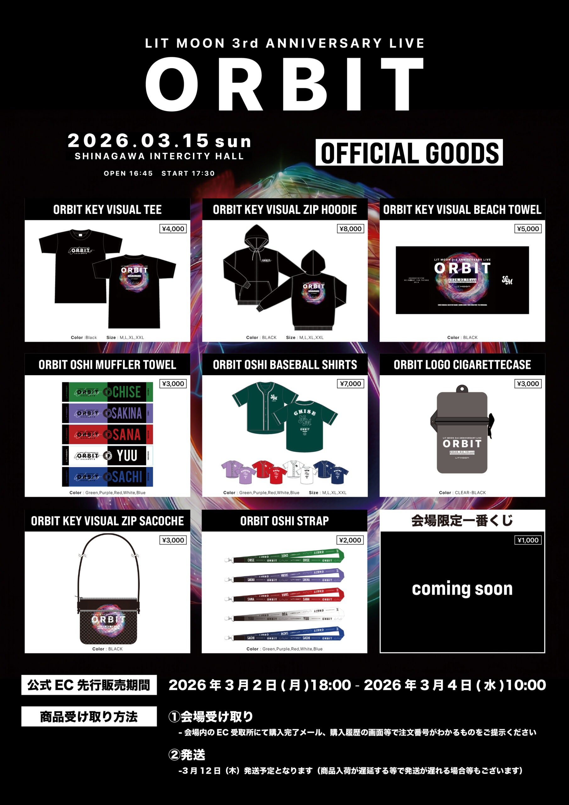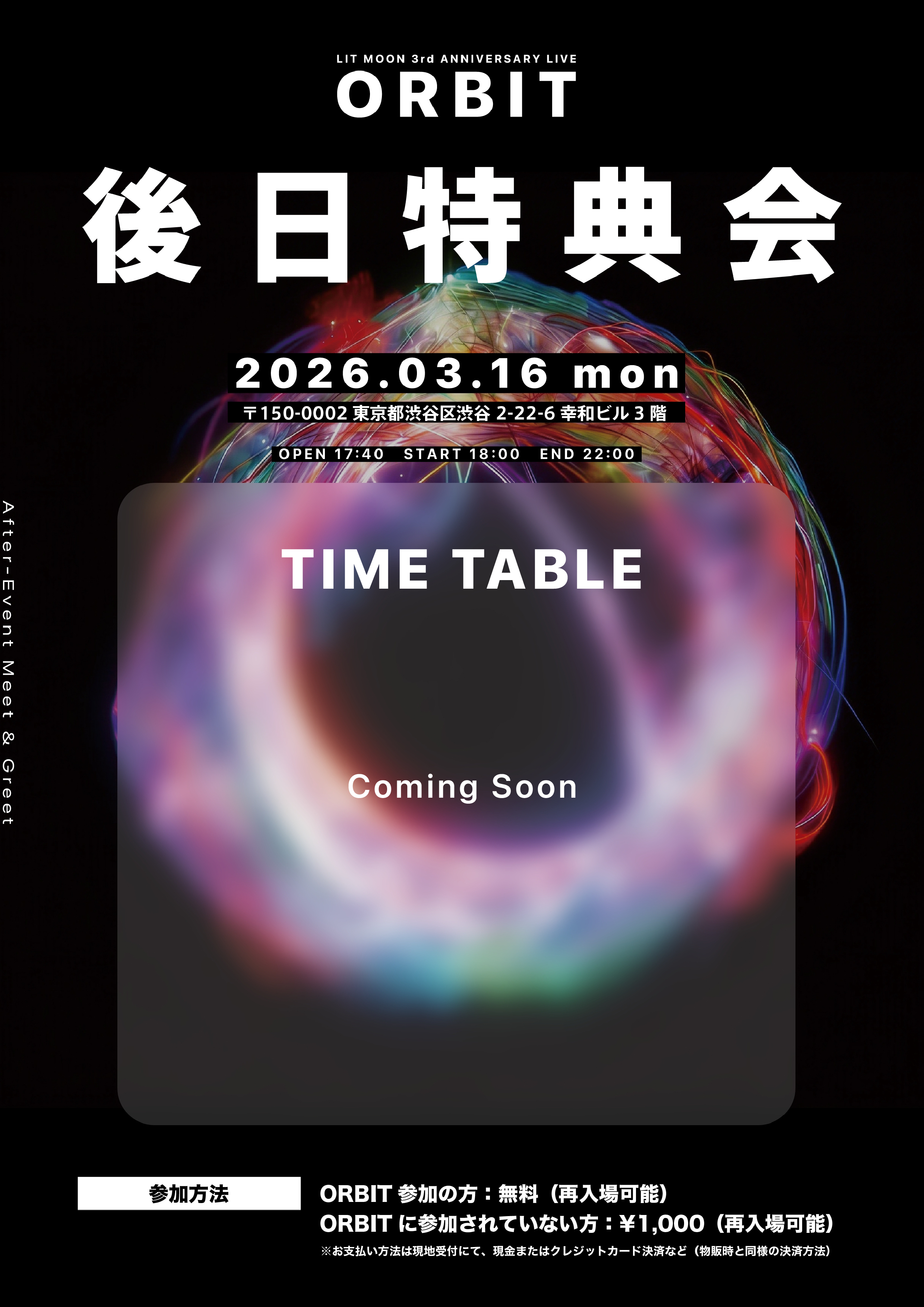 LIT MOON 3rd ANNIVERSARY LIVE "ORBIT"ではメンバーへのプレゼント・手紙はお預かりすることが出来ません。ご了承いただけますようお願いいたします。